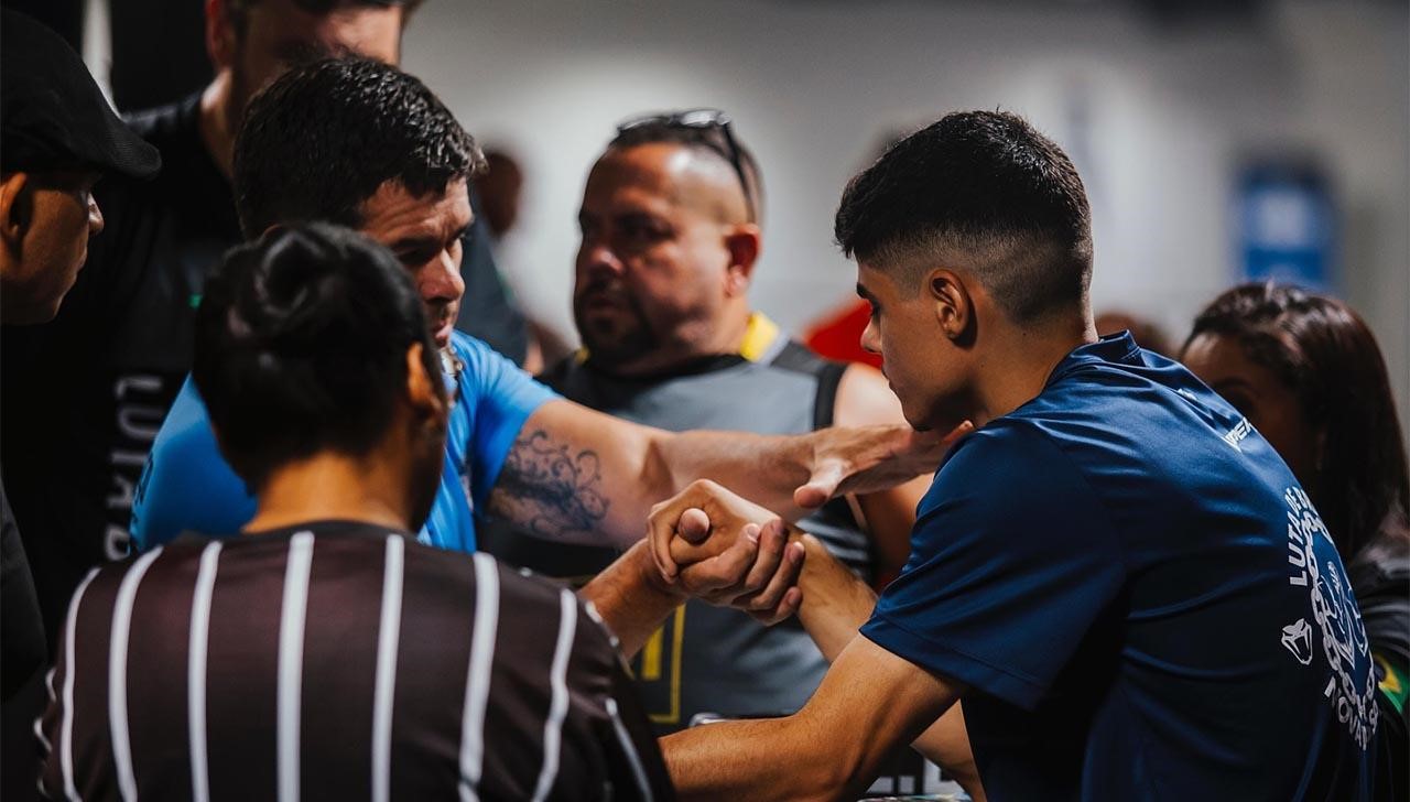 Luta de braço: popularmente conhecida como braço de ferro ou queda de braço, é uma competição em que dois atletas, com um dos cotovelos apoiados em uma superfície plana, enlaçam mãos e punhos. Vence o que leva o braço do adversário para o lado, fazendo com que toque totalmente a superfície.